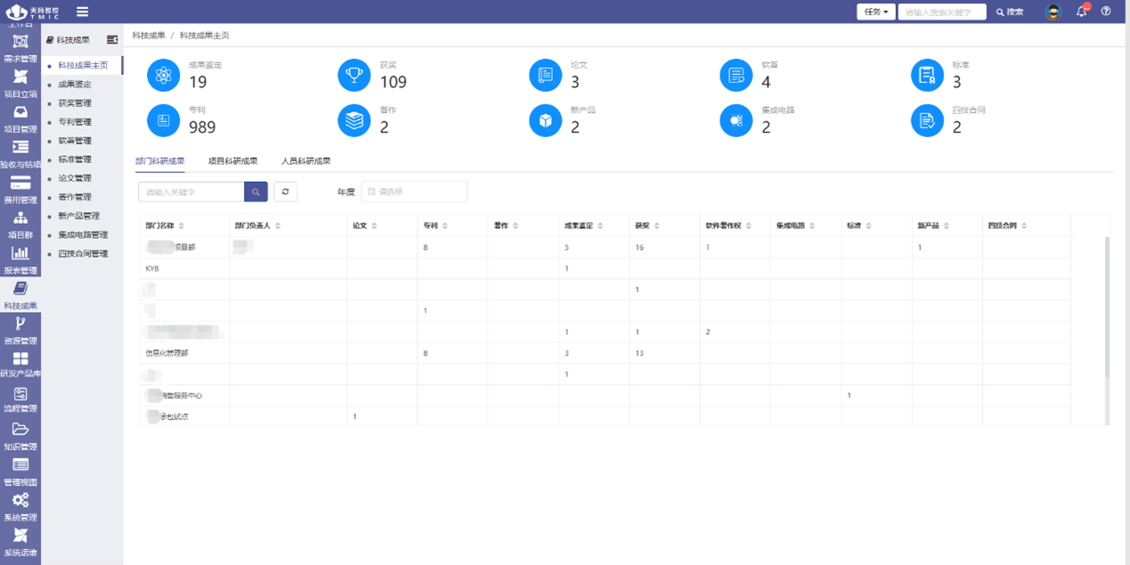 包括各部门科研、项目科研、人员科研成果。主要成果类型包括:成果鉴定、获奖、论文、软著、标准、专利、著作、新产品、集成电路、四技合同等。